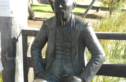 Possum Statue A life size statue of a man known as 'The Possum', who when disgruntled by life during and took to living off the land.